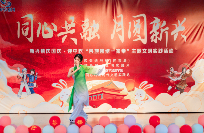文艺表演精彩纷呈,古典舞《幽兰》衣袂翩跹、气韵悠远,《民族舞串烧》则以欢快的节奏生动展现了民族文化的绚丽多彩与无限活力。朗诵《月满华诞,家国同圆》声情并茂、掷地有声,抒发了对国泰民安、万家团圆的美好祝愿;大合唱《我爱你中国》引发现场观众强烈共鸣,众人挥动旗帜、齐声高歌,将活动气氛推向最高潮,用歌声共同表达了深沉炽热的爱国情怀与团结奋进的坚定信念。