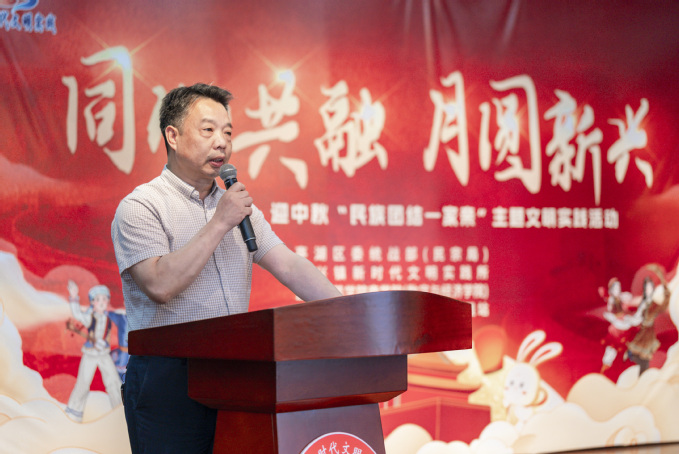 活动伊始,亭湖区委统战部副部长、民宗局局长徐江向各族同胞、师生代表致以节日问候,并以习近平总书记新疆之行中少先队员敬献石榴花的温暖瞬间为引,生动阐释了“各民族像石榴籽一样紧紧抱在一起”的深刻内涵。他强调,民族团结是国家稳定、社会和谐、人民幸福的基石,并号召各族群众团结友爱、互助互学、共同发展。值此双节同庆之际,还为现场群众送上“月圆人安、家国同好” 的深情祝福,以寄语为桥,将 “家国同圆、各族同心” 的期盼送进每个人心中。