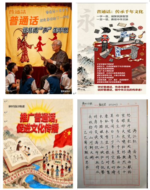 在“字正腔圆诵经典,红心志坚跟党走”主题活动中,创新设置微视频征集、红色配音秀、主题演讲大赛、AI海报设计大赛、书法大赛等环节,将语言能力提升与理想信念教育深度融合。微视频中,新生们用镜头语言展现普通话的魅力;配音秀中,《赵一曼》《瞿秋白》《秋瑾》等经典片段被新生们重新演绎;主题演讲大赛上,选手们以“青春向党”“文化自信与家国担当”为核心,结合语言学习感悟与红色故事,展现新时代青年的信念与追求;书法大赛里,同学们挥毫书写“满江红”“风华颂”等经典词句,让笔墨承载信仰力量;AI海报设计环节,新生们用创意设计传递红色精神。