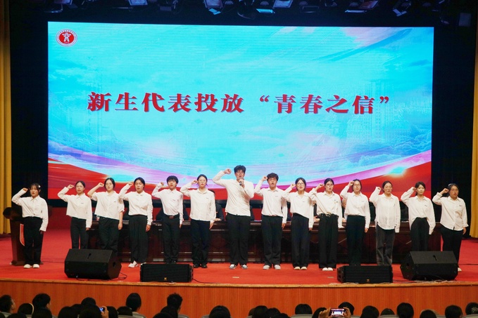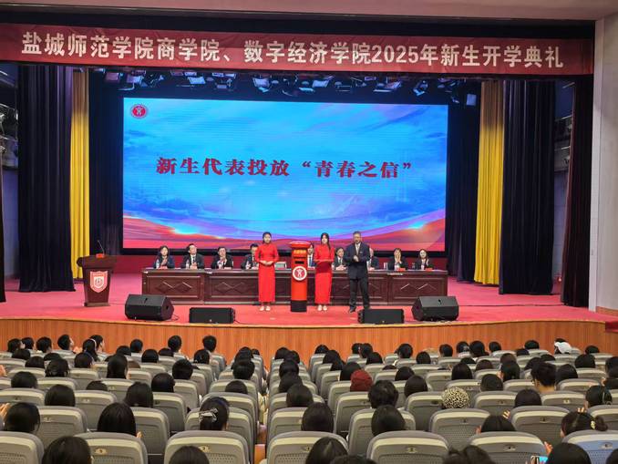 典礼上,学院党委书记韩诚为新生开启青春信箱,新生代表依次投放“青春之信”,宣读青春誓词。四名新生代表以《承盐师薪火,赴青春山河》的宣言向大家表达了对大学生活的憧憬与传承盐师精神的决心。主席台就坐的领导老师为2025年军训先进个人颁发荣誉证书,并给2025级新生代表佩戴校徽。