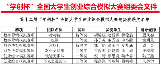 10月17日-19日,第十二届“学创杯”全国大学生创业综合模拟大赛总决赛在成都理工大学举行。经过省赛、半决赛的激烈角逐,共221所高校,287支队伍入围全国总决赛。我校商学院、数字经济学院组建的6支代表队在比赛中表现突出,共斩获全国总决赛特等奖2项、一等奖1项、二等奖3项的历史最好成绩。