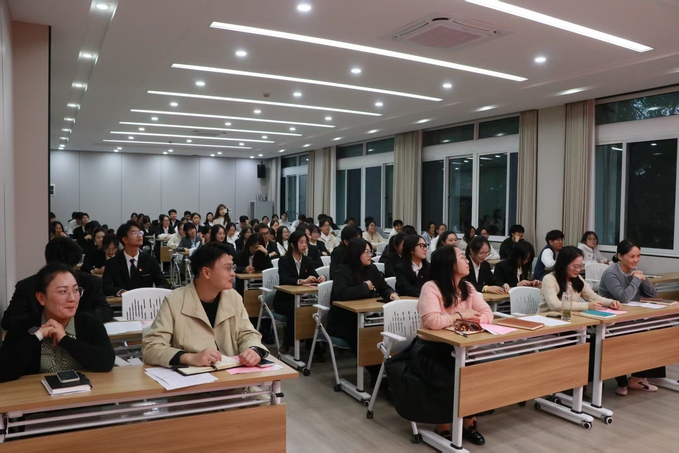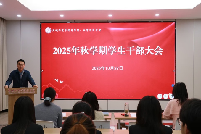 为加强学生干部队伍建设,扎实推进新生入学教育,10月29日下午,商学院在逸夫楼二楼李想数字报告厅召开2025年秋学期学生干部大会。学院党委副书记秦圣阳、全体辅导员、全体学生组织成员及班长、团支书参加会议。会议由学院团委副书记耿明主持。