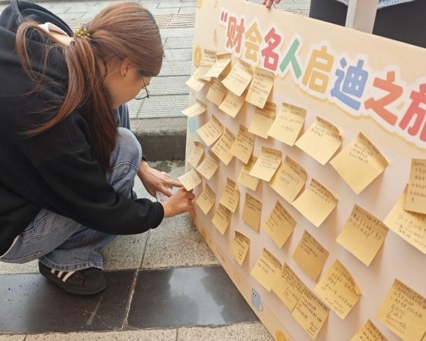 活动现场围绕“实用+启发”双主线,设计“省钱妙招大分享”与“财会名人启迪之旅”两大核心环节。“省钱妙招大分享”区,色彩明快的便利贴与主题KT板格外吸睛,同学们领取材料后,纷纷结合食堂就餐、网购消费、学习用品采购等场景,写下20字以上的专属省钱心得——从“网购先比价+凑满减,日常用品省出奶茶钱”到“宿舍共享洗衣液+二手教材循环用,环保又划算”,这些接地气的妙招被整齐张贴后,迅速成为现场讨论焦点,不少同学边看边记录,还主动与分享者交流实操细节。“财会名人启迪之旅”区则通过展架展示财会领域名家故事,同学们研读后在卡片上书写50字以上原创感悟,字里行间满是对行业精神的理解与未来职业的思考。工作人员全程引导秩序,及时收集作品并登记,让每个环节都高效推进。
