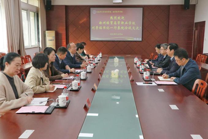 11月13日上午,徐州经贸高等职业学校党委书记、校长刘芳铭、副校长张传娟及部门负责同志一行8人莅临我院,围绕人才培养、科学研究、社会服务、文化传承创新、国际交流合作及“十五五”规划制定等重点领域展开洽谈交流。学院党委书记韩诚、党委副书记、院长殷凤春、党委副书记秦圣阳、副院长王力参加交流活动。