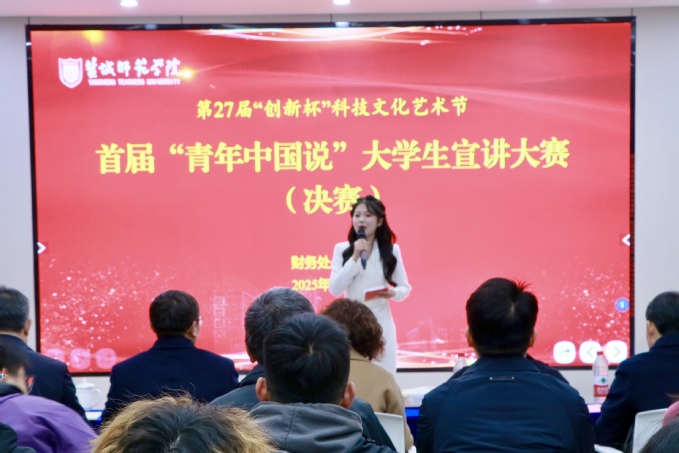 为深入学习贯彻党的二十届四中全会精神,引导青年学子胸怀“国之大者”,12月9日晚,校第27届“创新杯”科技文化艺术节重点活动之“首届‘青年中国说’大学生宣讲大赛”决赛在商学院二楼李想数字报告厅举行。校党委常委、副校长韩雅丽,党委常委、统战部部长费正皓等专家担任本次大赛评委。