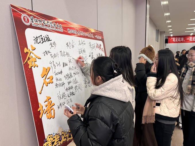 会前,考研学子们纷纷在“上岸签名墙”上签下自己的名字。财管228班沈佳璇、旅管2214班袁梓毓作为考研学生代表分享了备考心得。学院还为考研学子准备了暖心慰问礼包,寓意一战“橙”硕、“笔”下生辉。