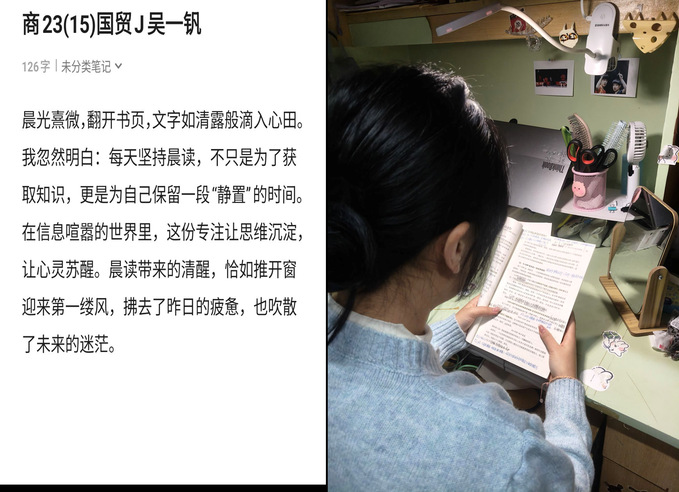 活动期间,每日清晨7点至9点半的校园里,处处可见学子们晨读的身影。图书馆的阅览区、教学楼的走廊转角、校园湖畔的长椅旁,都成为了天然的晨读阵地。同学们手捧专业课本、英语美文、文学经典、社科读物等积极健康的读物,或静心研读、圈圈点点,或轻声诵读、沉浸其中。大家通过指定打卡小程序,按时上传清晰展现书籍内容与晨读场景的照片,以及100字左右结合当日阅读内容的真实感悟。字里行间,既有对专业知识的深度思考,也有对文学经典的深刻体悟,更有在坚持晨读中收获的成就感与自信心——有人在专业书籍中探寻学术逻辑的奥秘,有人在诗词歌赋中感受传统文化的魅力,有人在英语美文中锤炼语言表达,每一份专注与认真,都让冬日的校园充满了向上的力量与温暖的生机。