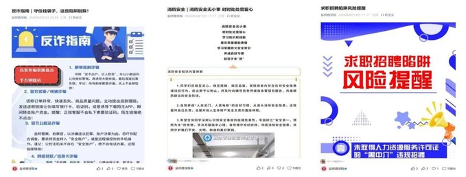 4月15日上午,学院组织全体辅导员和各班级学生集中观看“千万师生同上一堂国家安全教育课”,确保教育覆盖无死角,并以此为契机,各班级围绕总体国家安全观召开国家安全主题团课。同时,学院聚焦电信诈骗、消防安全、求职安全等重点领域依托微信公众号推出系列专题,实现线上教育与日常引导有机衔接,持续拓展宣传教育的广度与深度。