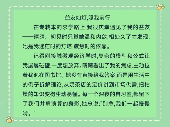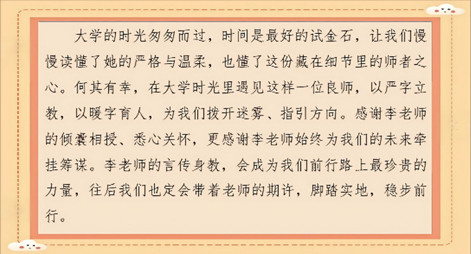 活动启动后,全院学子积极响应、踊跃投稿。经统计,共收集参赛作品115份。投稿作品中,有同学深情讲述教师的言传身教——课堂上的耐心解惑、迷茫时的悉心指引、挫折后的鼓励包容,字里行间满是对老师的感恩与敬意;也有同学真切记录辅导员的暖心护航——谈心谈话时真诚关怀、宿舍走访时细致关切、关键节点处悉心叮嘱,用点滴小事勾勒导员的温情模样;还有同学细腻描摹益友的并肩同行——困境中的相互扶持、成长中的彼此成就、迷茫时的并肩前行,生动展现了同窗之间纯粹真挚的友谊,每一篇作品都凝聚着同学们的真心与深情,传递出校园里最动人的温暖力量。